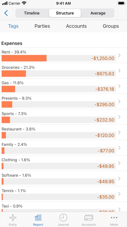 • Structure of expenses and income, split by tags, parties, accounts or groups, in percentages and absolute amounts, for any report filter.