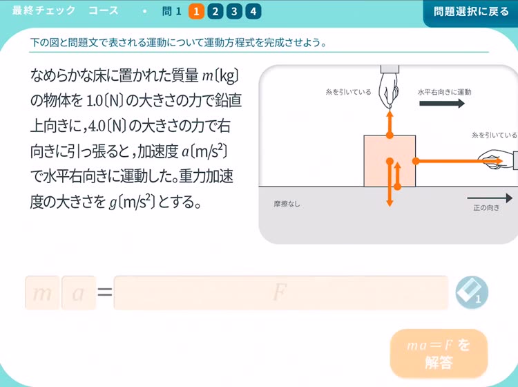 「グラフの読解」「力の矢印の描図」といったコーナーごとに、グラフを描く・矢印を描くといった直感的な操作で練習できます。