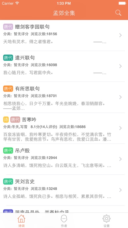 《孟郊全集》囊括诗囚孟郊生平全部古诗词及文言文等作品,内容由诗文、注释翻译、名家赏析、生平简介、诗词风格、趣闻轶事等多部分构成。让大家轻松学习古诗文,增长知识。
