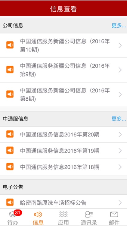 新通服移动OA用于公司内部OA管理,功能包括常用的办公流程审批,例如:收发文/出差/会议纪要/签报/请假/合同等等流程的审批,可以审批流程,查看流程日志,审批意见。通讯录功能是公司通讯录列出公司的组织架构和人员的联系信息。信息模块包括公司信息/中通服信息/公告查看。收发邮件,可以查看收件箱/发件箱等,查看邮件内容。