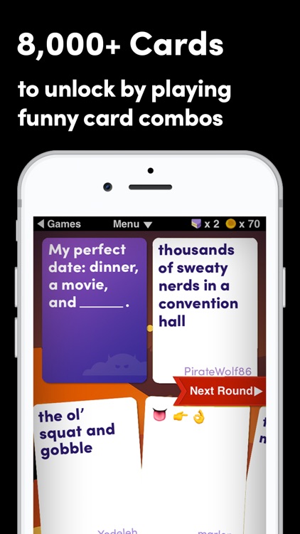 - A Question Card is shown to everyone, e.g. "Nothing excites a group of Catholic Priests more than ____."