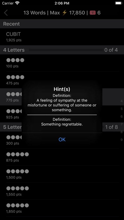 Even puzzles with relatively few words have some obscure ones, and at some point you're going to need some assistance. Helpfully, you have some options! Hints are the main way to get unstuck. Tap over to the word list and tap any word you haven't found to bring up a menu that lets you see any hints you previously got for that word, ask for a new hint, or to reveal the word. Hints and reveals cost tickets which you earn in the game, by viewing ads, or by purchasing a ticket pack.