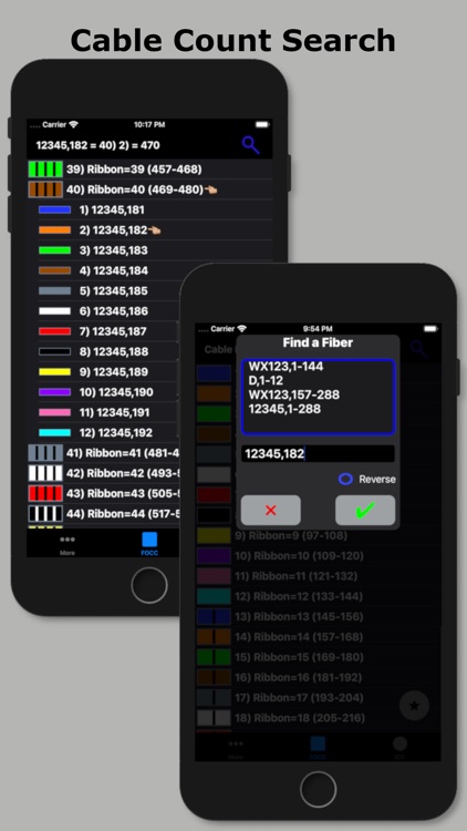 Locate fibers with or without cable counts. Simply enter a strand # without a cable count or enter the 'Cable,Fiber' if you're using a complex cable count (app auto detects if there's a count or not). The app will then auto expand and place index pointers at your found fibers locations.