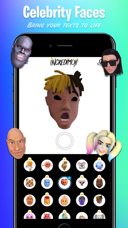 Incredimoji lets you seamlessly swap your face, in real-time, and replace it with an insane amount of choices - including celebrities, emojis, rappers, politicians, famous musicians, TV and movie stars, cartoons, animals and much more
