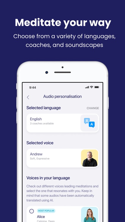 - A hyperpolyglot library with a diverse range of meditations that you can tailor to your needs and preferences: choose your favorite voice, set the pace, and select background sounds to craft a truly personalised and immersive meditation experience.