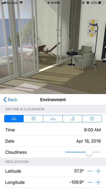 • Achieve natural lighting by setting up true geolocation, time of day and cloudiness.