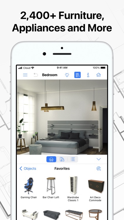 • Add and move furniture and other objects (2,400+ items), and apply physically based materials (2,100+ supplied materials).