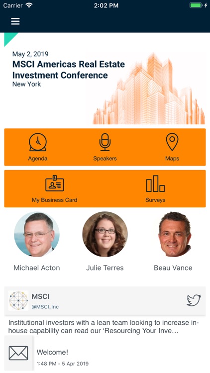 The MSCI Events app is the official app for all MSCI events. This app will allow attendees to stay up-to-date with the latest event information and receive real-time notifications. Attendees will also be able to view exhibitors and facility maps, provide live feedback and much more. This native downloadable conference app is available for free to conference attendees for iPhone, iPod Touch and iPad.