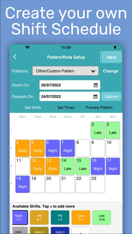 - Common shift patterns and rotas built-in: