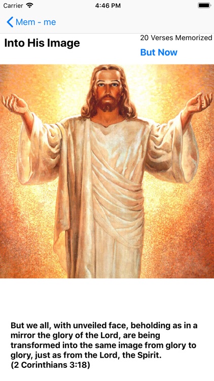 - The new “Transformed Into His Image” screen is a graphical status report of the number of verses memorized, and also a challenge to apply those verses by becoming more like Him. Further, it is a reminder that Jesus is coming again, perhaps soon! For each verse that is memorized, one “box” is uncovered to reveal a little more of an image of the glorified Christ. The uncovered boxes are slightly shaded, a reminder that even at our best we see only a partial image of His glory. Touch the “But Soon!” button for a full and clear image. So let’s live for Him and grow in His likeness while we still have the opportunity.