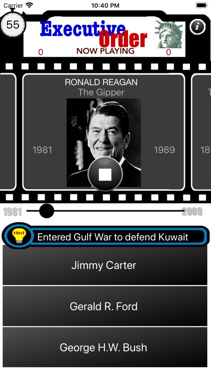 Welcome to Executive Order! The object is to ascend the list presidents in order of their terms. For example, suppose you're initially presented with 'President Ronald Reagan' who was inaugurated in 1981. Now you're given the option to select from three other presidents int the buttons below - Truman, Nixon and George H. W. Bush. You would select 'President George H. W. Bush' since his term followed Reagan's. President George H. W. Bush would replace President Reagan and the slider would advance from 1981 to 1989. The object is to keep selecting later presidents until you reach the end of the given time range - indicated on the slider. Beware that you are under a one minute time limitation. Also, if you choose a president with an earlier term, the slider will move backwards, i.e. away from completing the date range.