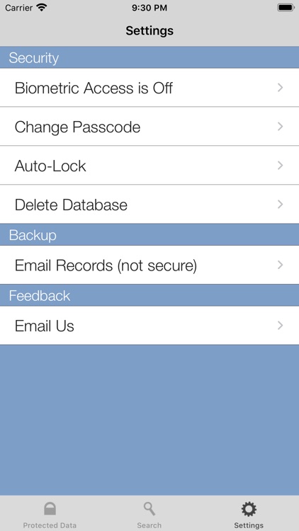 • Passcode Management, Auto-Lock, Encrypted Database Management, Search, Touch ID™/Face ID™, Manual Login