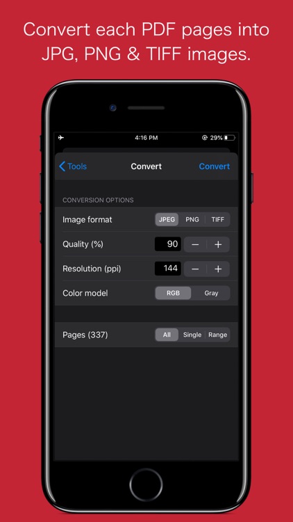 - Convert PDF into each page as images (JPG, PNG, TIFF).