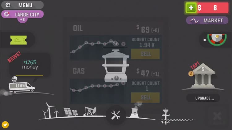 As any mogul knows, growth is impossible without new assets. Buy and upgrade Solar Panels, Oil Derricks, Drills, Windmills and much more!