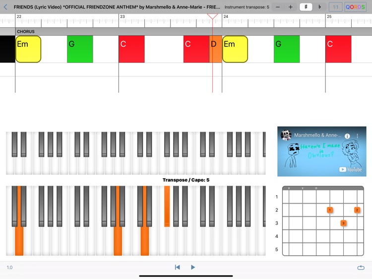 Qords. The new and fastest way to teach yourself to play the guitar and piano. With this app can you play along with the original music of your favourite artist. There is no other app that so quickly teaches you to understand and play music. Qords has been tested by 3000 students between the ages of 10 and 18 over a period of 3 years with amazing results. Both beginners and advanced musicians will benefit from the use of this app. Every song in the app shows you how to play it in all 12 keys. Qords is exclusive in its use of colour for chord recognition while at the same time the music is seen as a film that at any chosen moment can be frozen, slowed down or speeded up without influencing the key. And by swiping you can also zoom in and out. Every month the newest hits will be added to Qords with no extra cost. The introduction price for Qords is € 6,99.