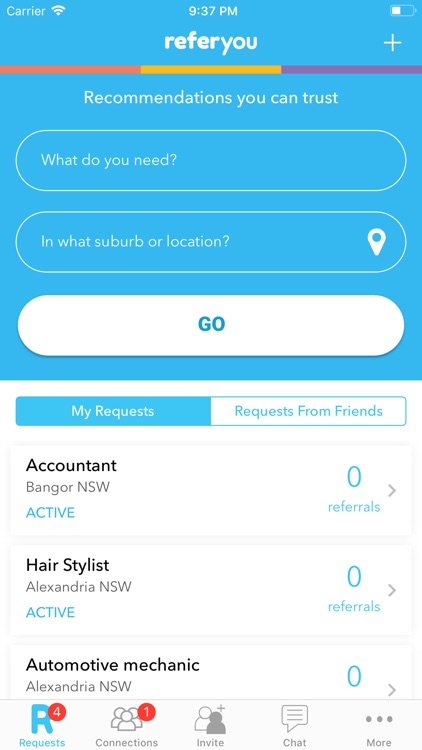For recommendations you can trust, you’ll probably ask somebody you know. Referyou is the social referral app that can connect you with your friends, so you can seek and offer recommendations when you’re looking for someone to get something done. It’s word of mouth in the palm of your hand. And if you are a service professional, you can create a professional profile, then your friends can recommend you to people who need the service you can provide. Quality leads from people you know.