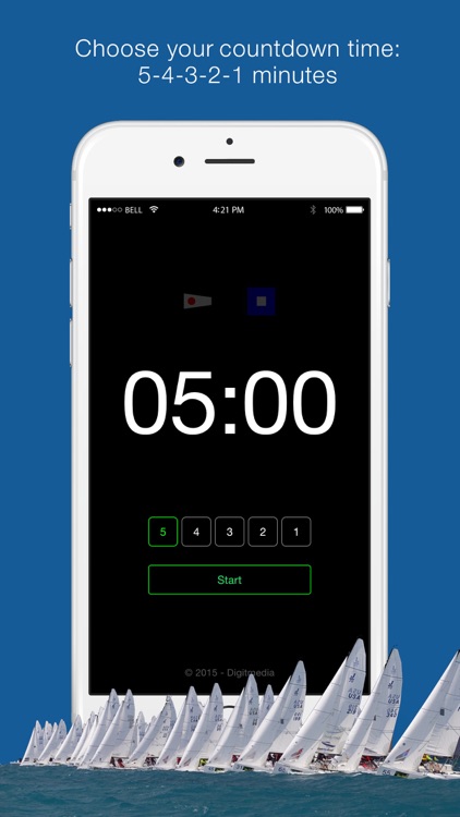 The default countdown timer is the 5 minutes start sequence (ISAF 5.4.1.0), but you can change the sequence easily just by changing the countdown time to 4, 3, 2 or 1 minute.