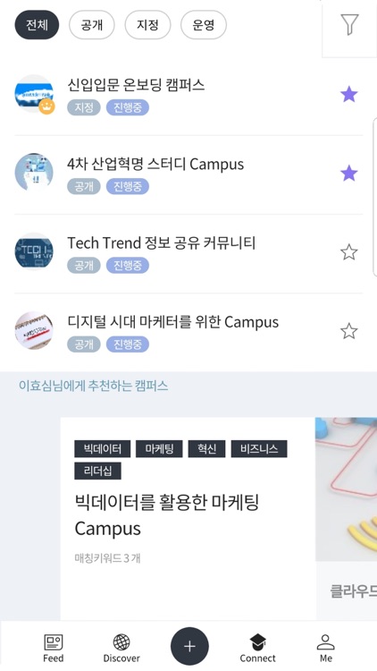 다양한 주제로 개설되어 있는 Campus에서 학습자들과 지식과 정보를 자유롭게 교류하며 경험의 폭을 넓힐 수 있습니다. 사용자 누구나 직접 Campus를 만들고 운영할 수 있습니다.