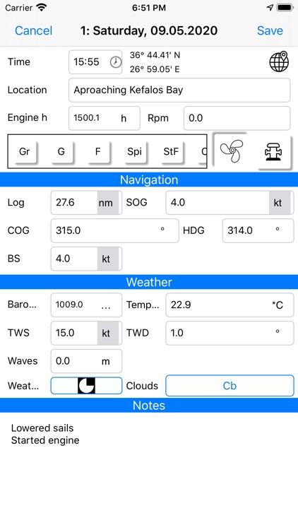 - Automatic log entries based on the specifications you make (course change, wind change, ...)