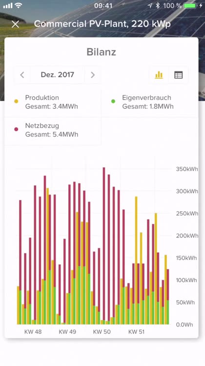 The App concisely presents the production, feed-in, self-consumption and uncovered kWh. These values are also available as a table listing. Current and historical plant data as well as connected components (for example heaters or heat pumps) can be visualized.