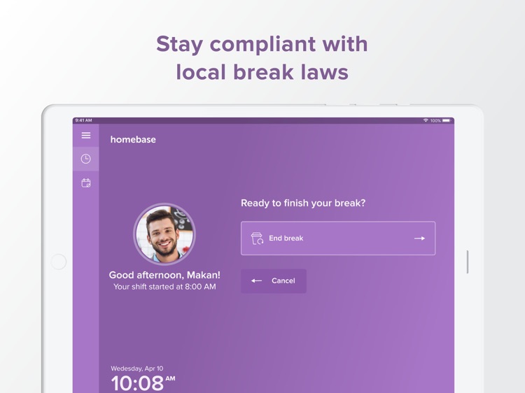 The Homebase time clock app for iPad works seamlessly with all of our time clock apps using a secure PIN. So your employees can clock in on your iPad and clock out from their smartphone, computer, or your point of sale terminal.