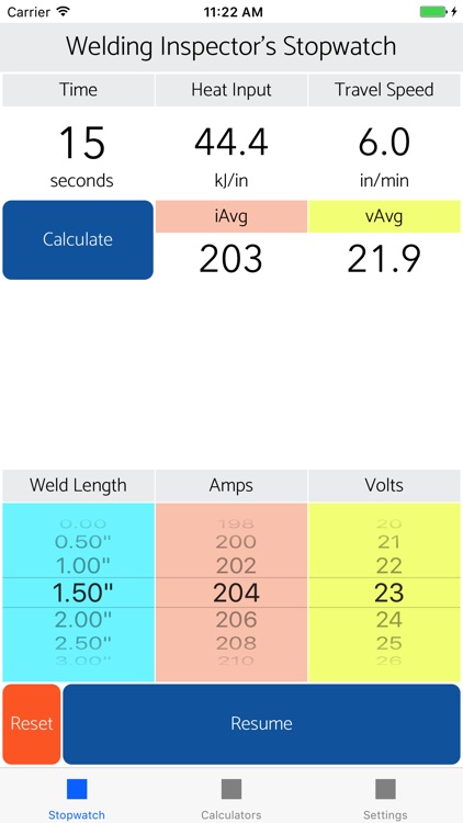 Welding Inspector's Stopwatch calculates heat input (kJ/in) and welding travel speed (in/min) by averaging the amps and volts input by the user while the stopwatch runs