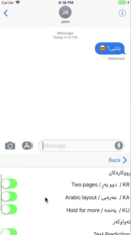 ئه‌م ئاپه‌ كیبۆردی سۆرانی كوردی بۆ ئای دیڤایسه‌كه‌ت زیاد ده‌كات به‌ڵام پێویسته‌ خۆت بۆ لیستی كیبۆرده‌كانت زیادی بكه‌یت له‌ سێتینگی كیبۆرد. ئه‌م كیبۆرده‌ ئیمۆجیش له‌ خۆ ده‌گرێت كه‌ ده‌توانی بۆ هاوڕێكانتی بنێریت