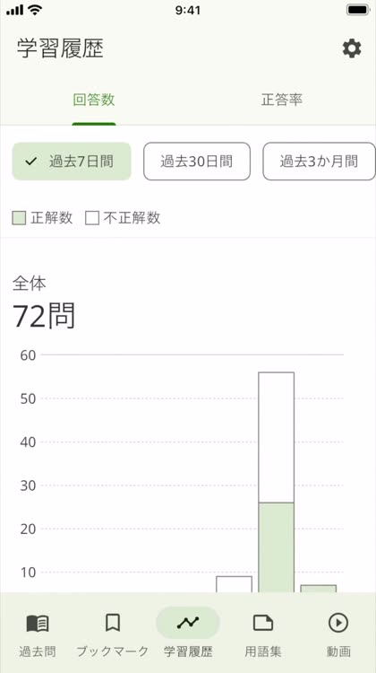 合格ラインに達しているかを確認できる正答率と、頑張りが可視化された解答数を確認して合格を目指そう!