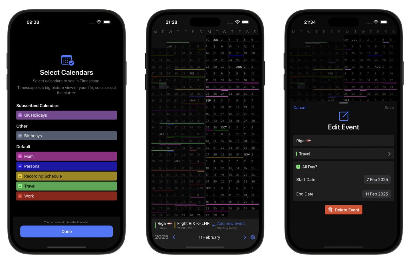 You probably already have a day-to-day calendar app like the stock iPhone version or a popular third-party option like Fantastical. Those are great to show what’s happening today, the next day, or even next week. But Timescape gives a big-picture view.