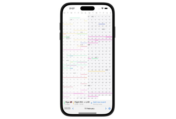 The app provides a full-screen grid view showing an entire year without gaps between the months. All events for the entire year are visible on the grid. Events with single days are shown as dots. Anything that spans over multiple days or an entire day is shown as a capsule.